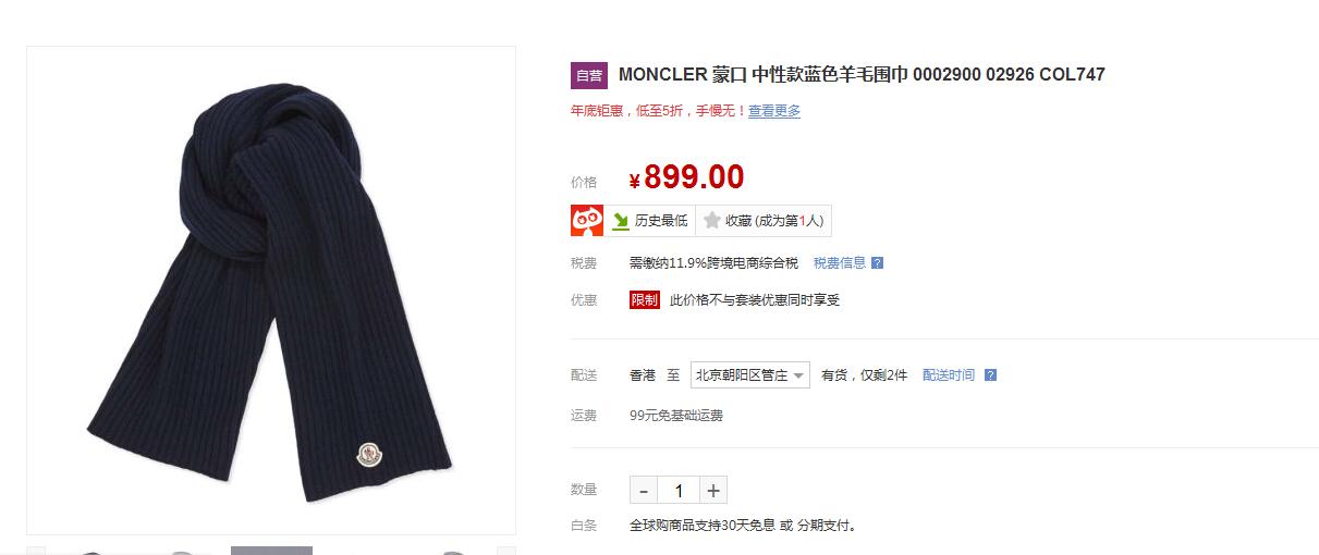 意大利Moncler是一家总部位于法国格勒诺布尔专门从事生产户外运动装备的著名品牌,在欧美是超牛逼的品牌!蒙口Moncler普普通通一款35%羊毛的围巾京东售价高达800+RMB(留意图一),这样的价格已经把我大宝拒之门外了!当然,想佩戴一条蒙口的围巾不一定要在京东或者专柜购买,那里真的很贵!伤不起啊!同样35%羊毛(留意最后一张图片有成分介绍)同样的质量,大宝这里只需要78RMB包邮,货源来自于原工厂尾单货(不走专柜),所以数量极少!在TB普通品牌的羊毛围巾都要100+以上、而且销量非常好(留意图二)!所以这款围巾大宝纯碎是给兄弟们姐妹们送福利拉人气的礼品!总数50几条,有需要的来秒吧!不秒也可以添加大宝的WEI信,里面有更多的外贸原单货!总有一款适合你!(备注重要信息:围巾是广告商品,卖一条亏一条50几条还可以承受得起)