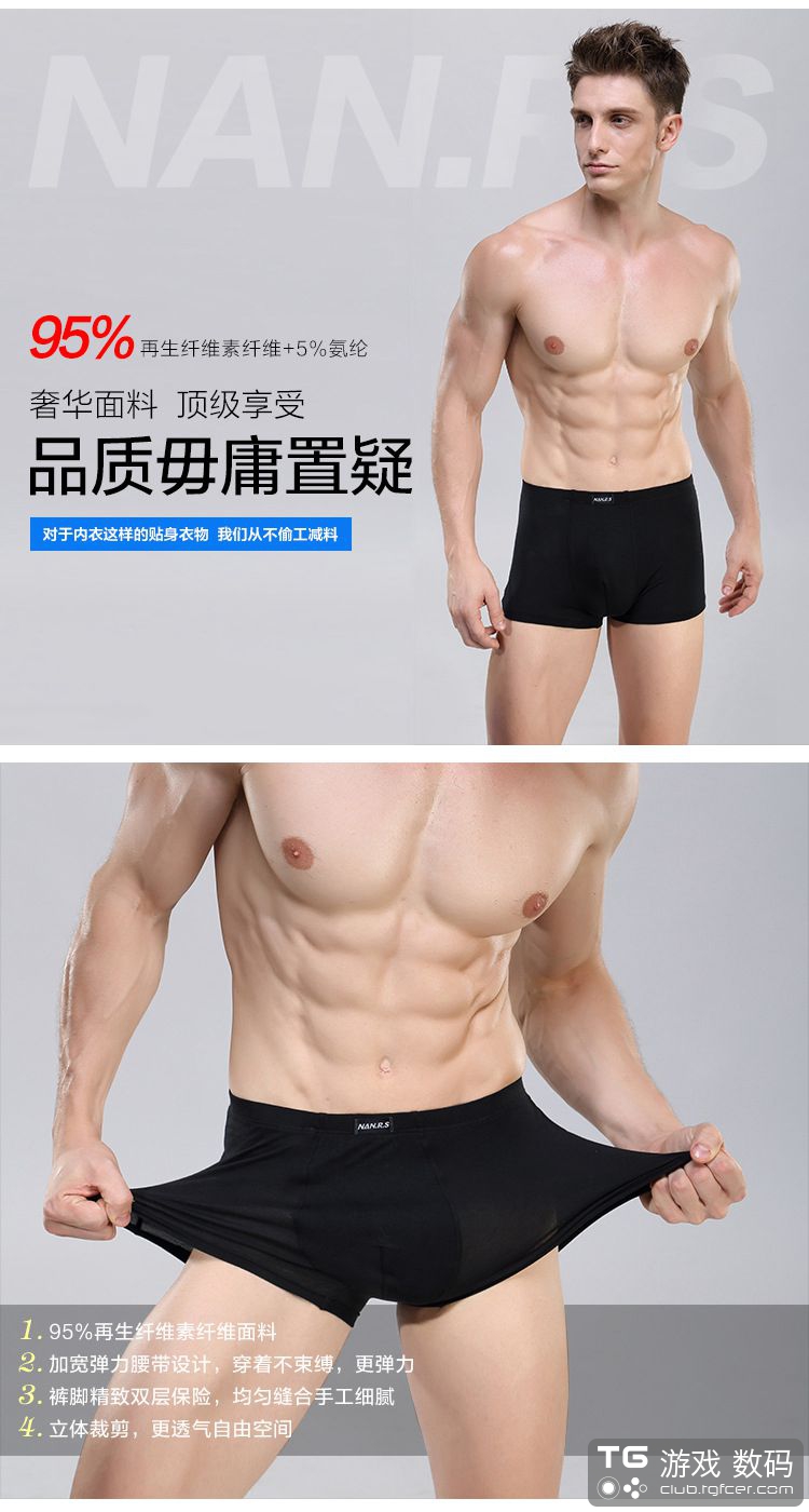 精选再生纤维,高档面料,能够更好的吸湿排汗,双车线工艺,阵脚密集,四针六线的,耐穿!u凸立体透气空间设计,承托男性前档,穿着舒适!