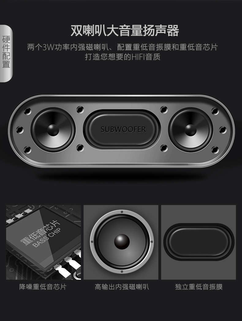 霸气双喇叭 蓝牙低音炮 HIFI音质 二色可选 个头不大 但出来的声音绝不是LOW的 可以插TF卡 可以接U盘 可以接电话 这个在东莞堆料 千台的采购价不会低于36元 电池用的是2000MAH 续航不错 商家今天淘抢购 标价59
