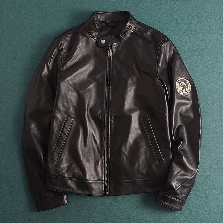 迪赛DIESEL新西兰进口绵羊皮机车风夹克外套!一线国际品牌、逼格超高!皮质非常细腻 担保100%绵羊皮而且整件皮衣都是、有一点拼接假皮直播生吃衣服!青岛皮衣代工厂订单、全部走国际路线、所以品质一点不容含糊、工厂招信誉担保!100%原单货!(款式真的太漂亮了!我最喜欢的就是左肩处印第安人头图案、特上档次、机车范十足、整件衣服顶级羊皮纯进口的,皮质非常细腻、而且比起国内羊骚味皮咱进口羊皮是淡淡香味、高档好太多了!类似这种羊皮夹克 商场以及柜子好贵的、没个千把块别说是真羊皮!所以很具有性价比!咱们一手货源!直接劲爆价!490一件!数量不多、S-3XL码 男人必须来件皮衣!注意码数偏小一码!