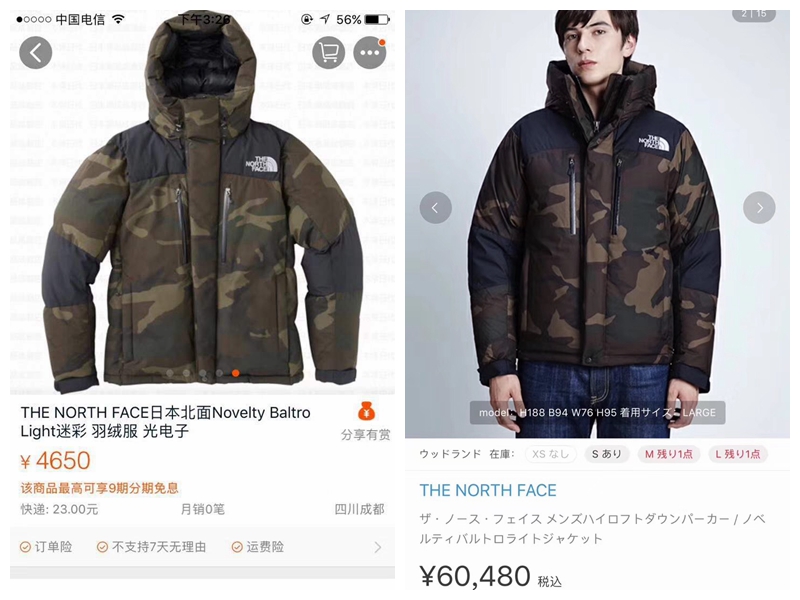 北面迷彩羽绒服!660包邮 代购60000日元大约3600+ 山东青岛永元工厂出品。百分百原单正品保真。国内无售。只出口日本。鹅绒300克超级蓬松。天气渐冷必须有压轴的牛逼货。百分百正品。防水效果无敌,纳米科技面料。有收纳袋可收纳。全身ykk定制拉链。百分百原公司货。老宋175,145斤穿M 版型也是无可挑剔 全部现货。全部原箱货。这款羽绒服采用的是是最新的黑科技面料:电光子
