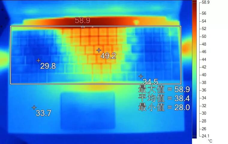 表面温度布局如上图所示,双风扇策略对这种机身较薄的机器影响很大,可以看到左右两侧温度和键盘中间温度差距非常明显,WASD键位区域连30℃都不到,中间却接近50℃了。