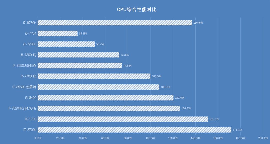 8代U的发热量大家应该也看到了,其实并没有想象中的那么夸张,我们通过这几天也测试了45W标准功耗下,i7-8750H的CPU综合性能水平,供大家参考: