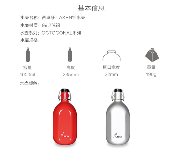 西班牙LAKEN户外登山铝水壶水杯 1000ml