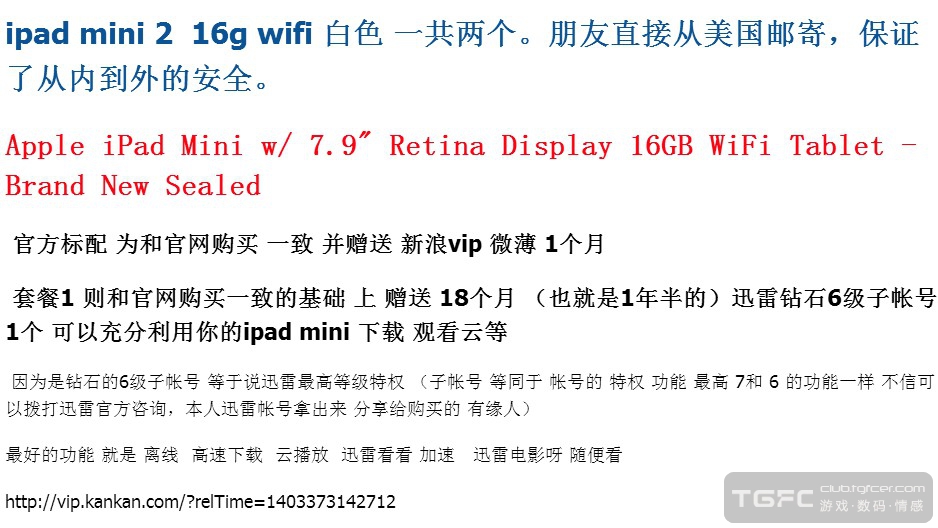 ipad mini 2 16g wifi 白色 一共两个。朋友直接从美国邮寄,保证了从内到外的安全。